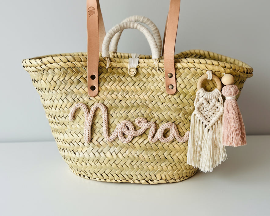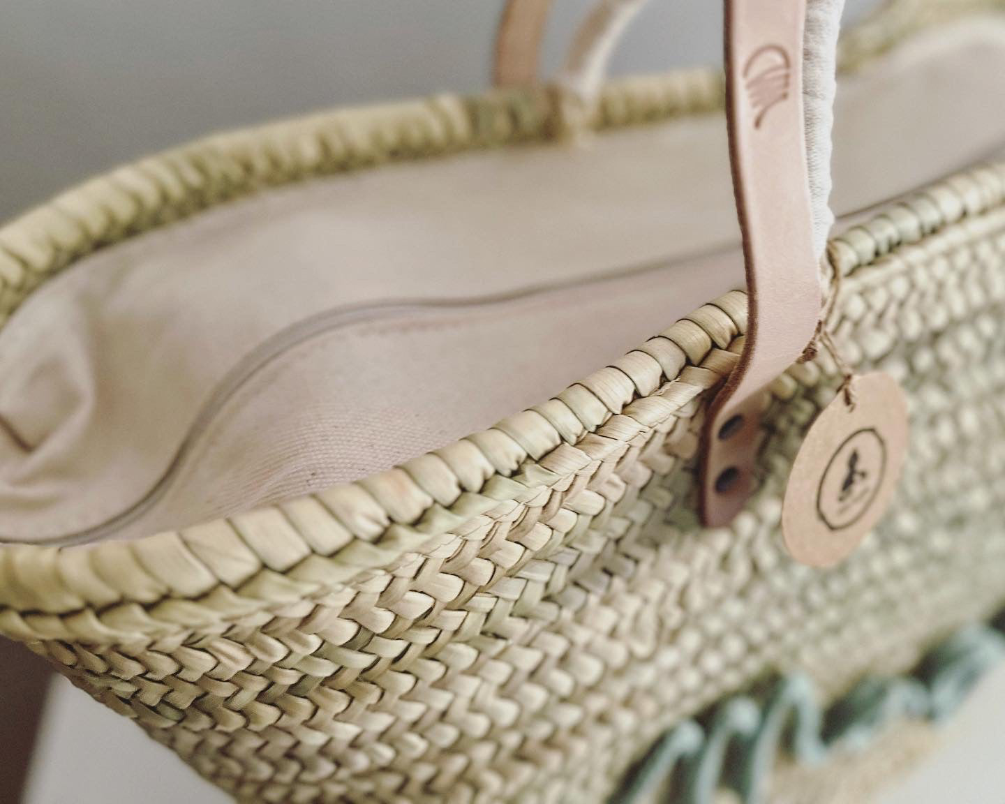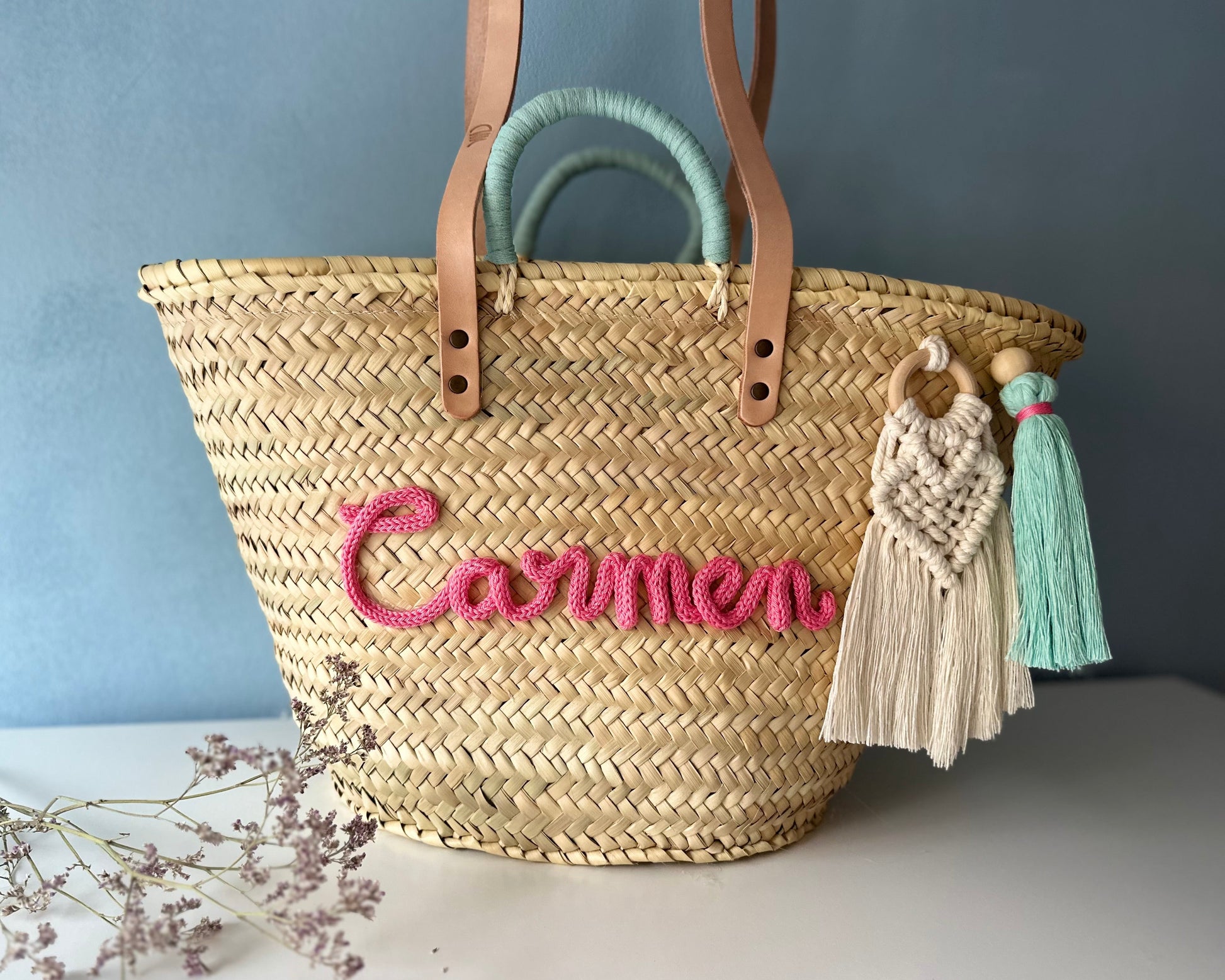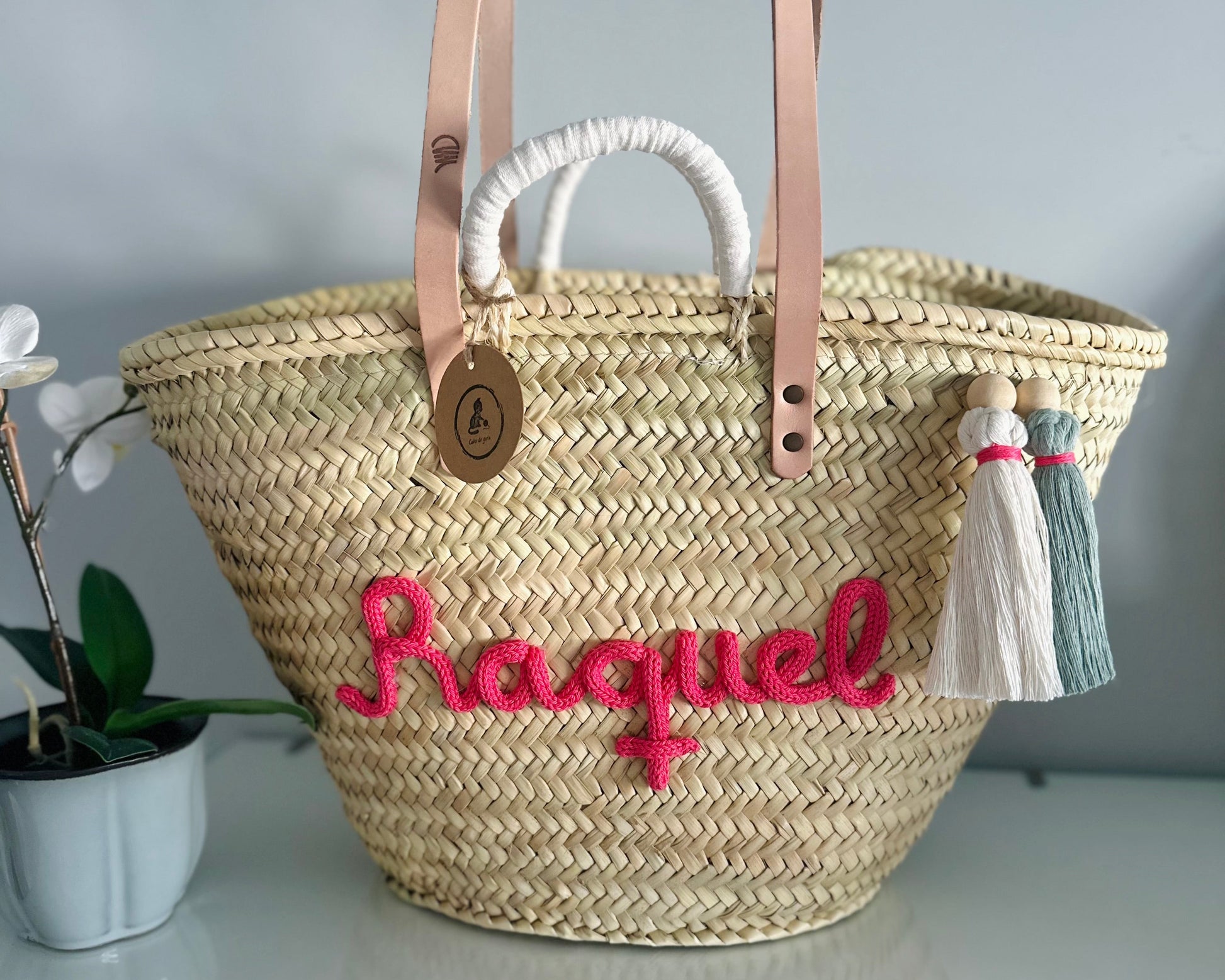 Capazos artesanales decorados y personalizados a mano, con asa corta forrada de colores y asa larga de cuero natural.