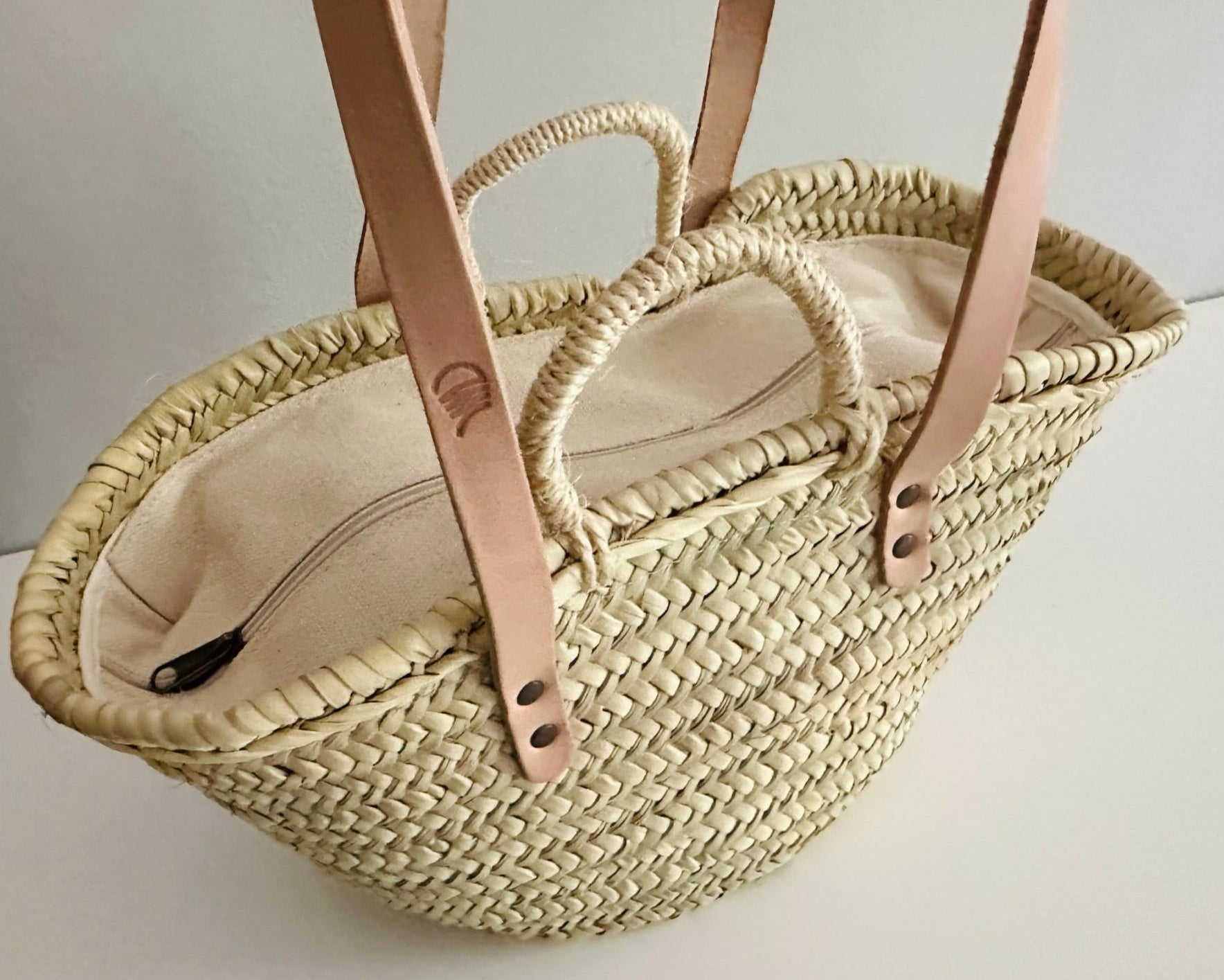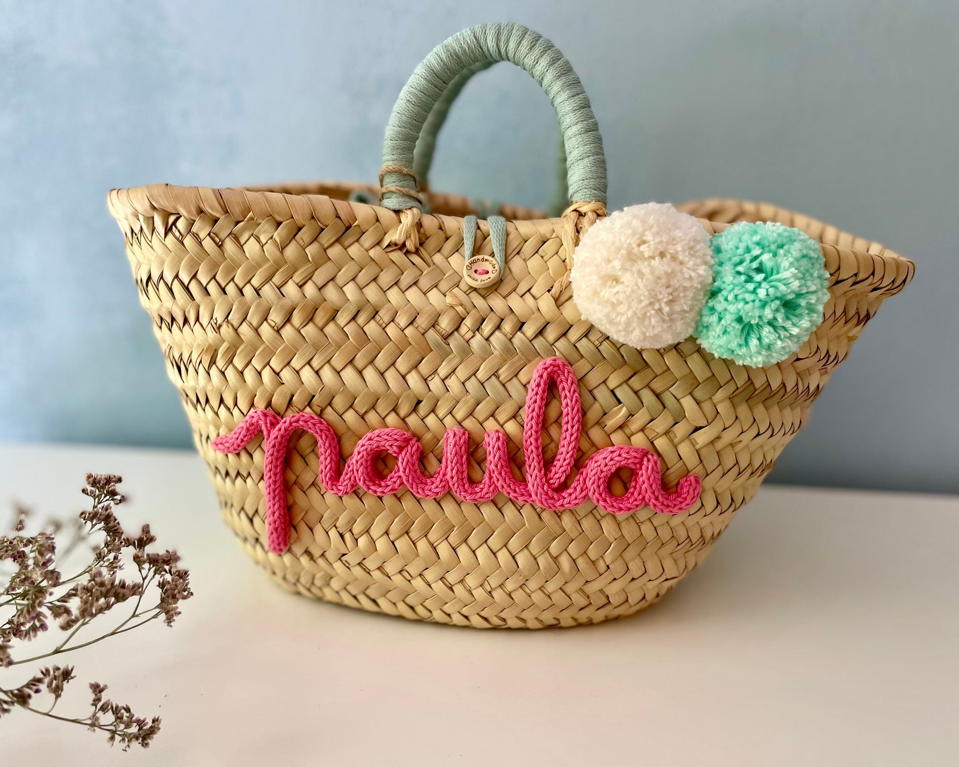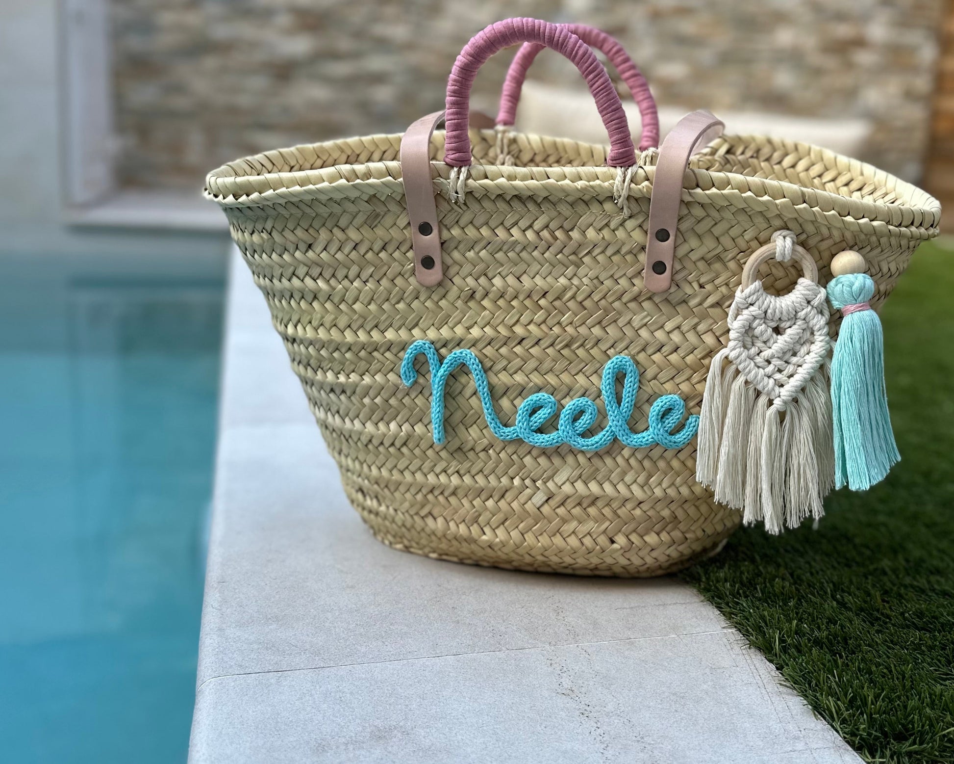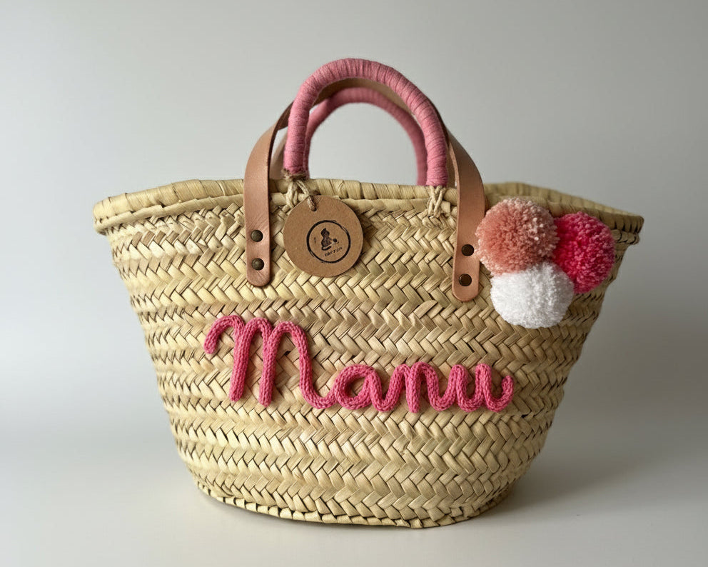 Capazos artesanales decorados y personalizados a mano, con asa corta forrada de colores y asa larga de cuero natural.