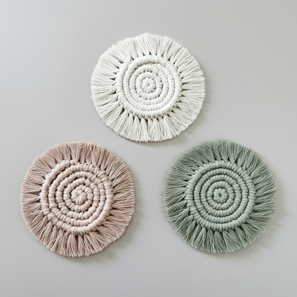 Posavasos ideales para darle un estilo boho a tu mesa. Puedes personalizarlos con los colores que más te gusten. Hechos a mano para ti. Complemento perfecto para tu mesa. Pueden ser un detalle original para una nueva casa. También detalles para invitados. Elige entre todos los tonos y combínalos a tu gusto!